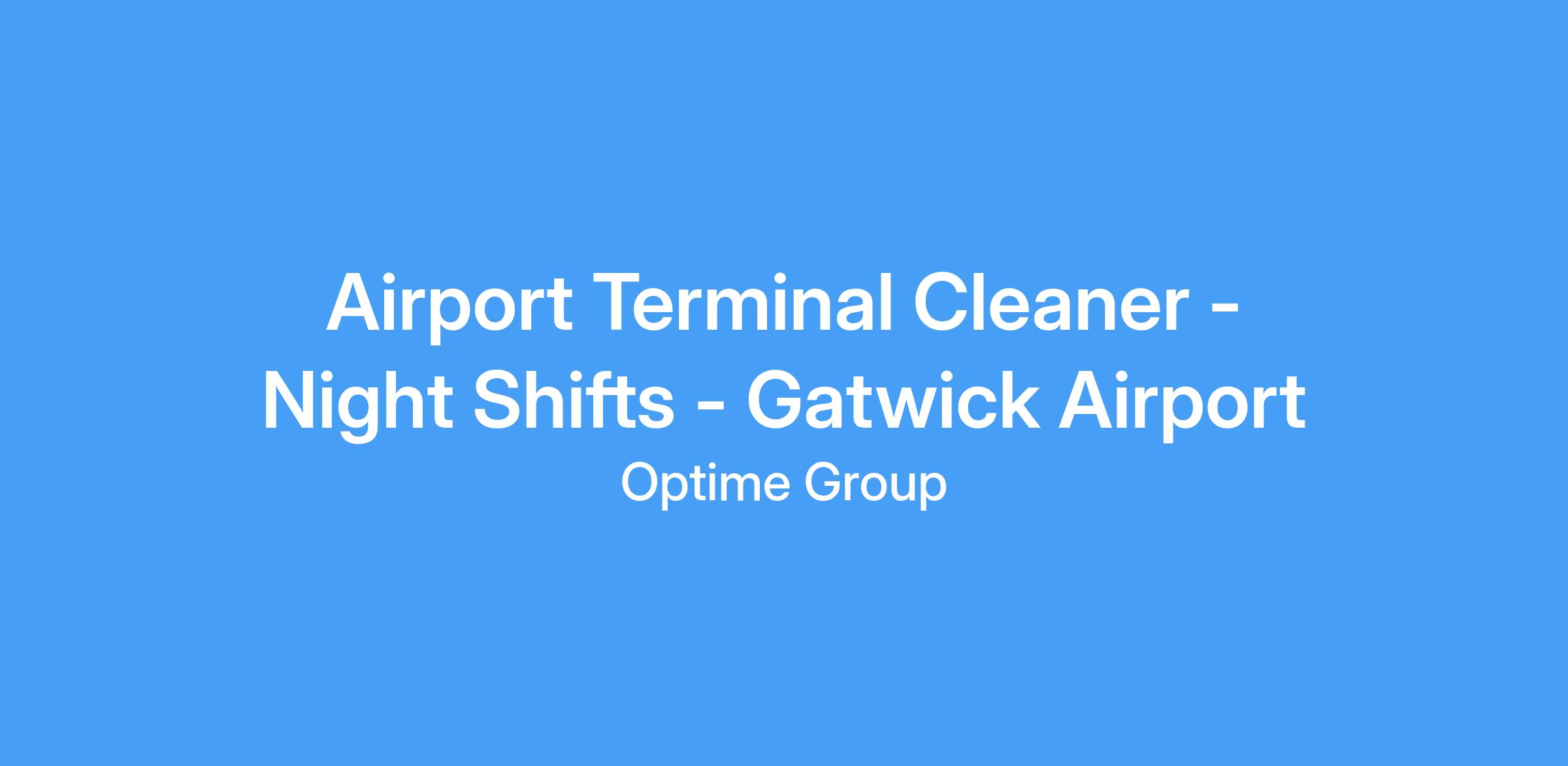 DescriptionAviation Recruitment experts Optime are excited to be recruiting for Airport Cleaners to join one of our well-respected and successful clients at Gatwick Airport. This job offers full time hours, overtime opportunities and an immediate start. This is a very enjoyable role with a great company providing fantastic working conditions and facilities.