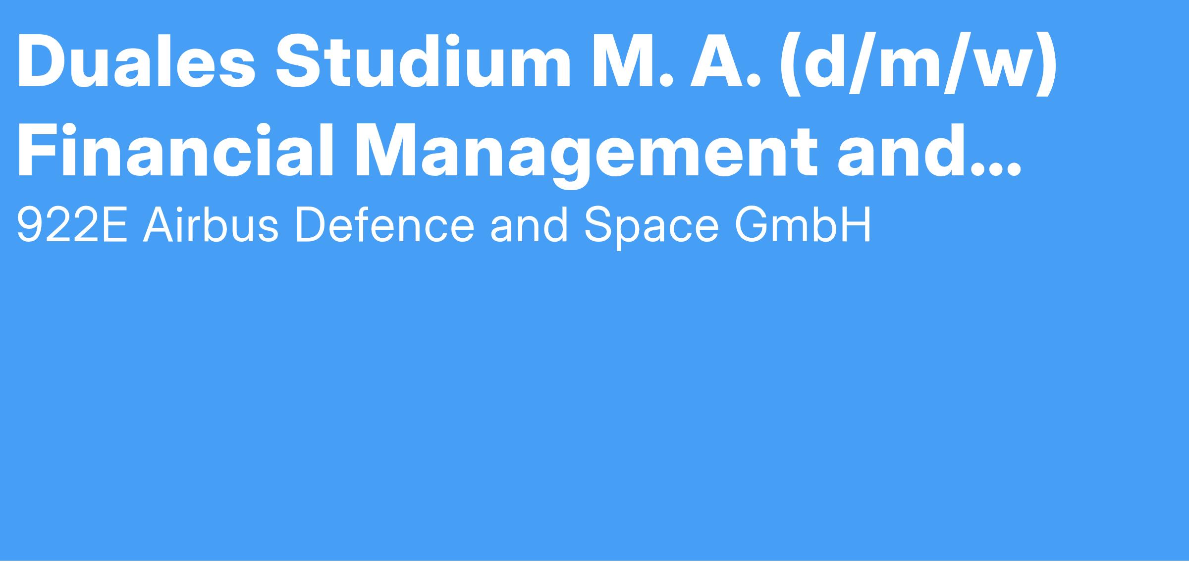 Du hast dein Bachelorstudium mit wirtschaftswissenschaftlichem Schwerpunkt erfolgreich abgeschlossen und suchst nach einer neuen Herausforderung? Du besitzt eine Affinität für Zahlen und möchtest Einblicke in das operative Finance-, Tagesgeschäft, das Controlling und in die strategische Unternehmensführung bekommen? Dann bewirb dich jetzt für den Masterstudiengang Financial Management & Controlling bei Airbus Defence and Space und durchlaufe in drei Semestern spannende und abwechslungsreiche Theorie- und Praxisphasen! Dich erwartet ein idealer Mix aus interessanten Aufgaben im Unternehmen und lehrreichen Studienphasen an der Technischen Hochschule Ingolstadt.