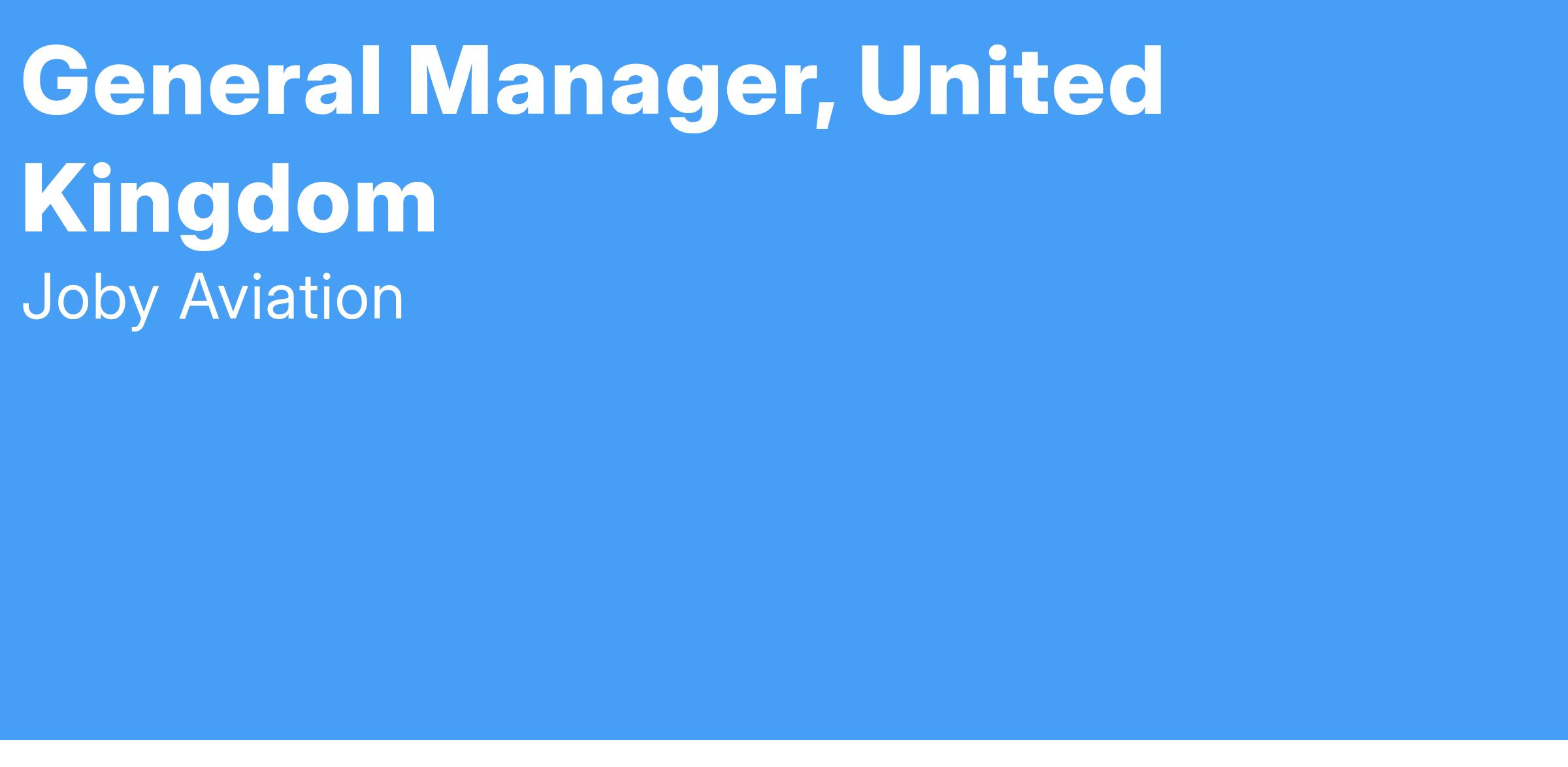 Joby Aviation is seeking an experienced leader and self-starter to join as the founding General Manager (GM) for the United Kingdom. As General Manager for the UK, you will report to the US-based President of Operations and have the unique opportunity to launch, develop, and own the P&L for one of the first air taxi services in the world. This full-time role is located in London, UK. 30% travel is expected.